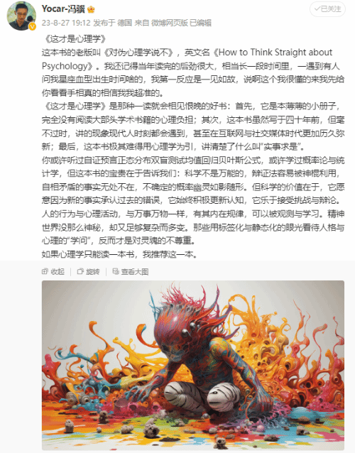 近日,游戏科学创始人冯骥在微博推荐了一本名为《这才是心理学》的书,在此微博下,有一家图书品牌工作室询问是否有机会合作推出《黑神话》相关图书。