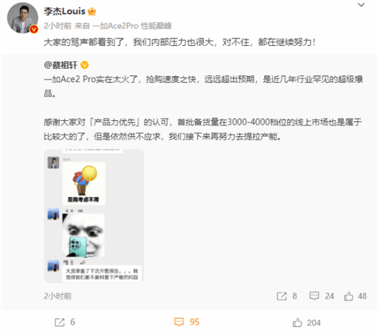 此前,一加Ace 2 Pro开售,凭借2999元起售价和高端配置,该机首批20万台备货3分钟全部售罄。一加手机中国区总裁李杰今日表示:“大家的骂声都看到了,我们内部压力也很大,对不住,都在继续努力!”