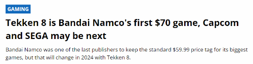 目前,世嘉、卡普空等日本厂商的部分作品仍保持着60美元的售价,但万代南梦宫则准备借《铁拳8》正式步入70美元领域,本作也是万代的首款70美元游戏。