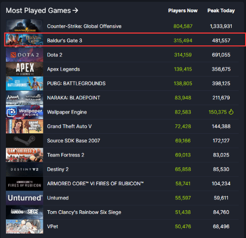 据Steamdb数据显示,《博德之门3》即使是在发售一个月之后依然保持着不俗的热度,稳居Steam热门游戏榜第二名,仅次于热门游戏《CSGO》。