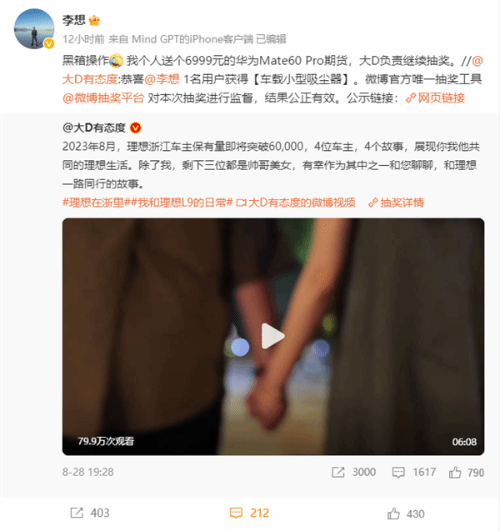 我抽我自己这一结果让李想哭笑不得,调侃“黑箱操作”,并做出“补救”:个人加送个6999元的华为Mate 60 Pro期货,继续抽奖。
