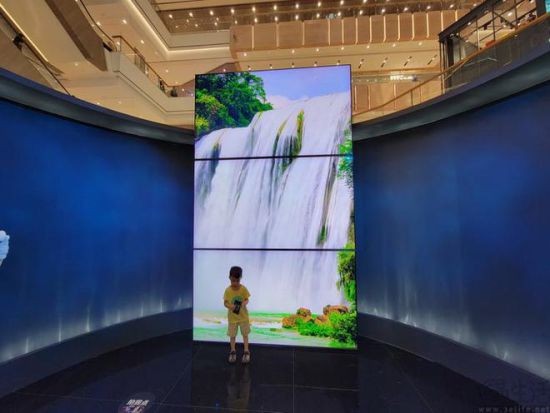 几乎有两个人那么高、由三台巨屏拼接而成的电视“瀑布墙”,直观地宣示着98英寸QLED电视的超大面积,以及超薄机身所带来的视觉冲击力。