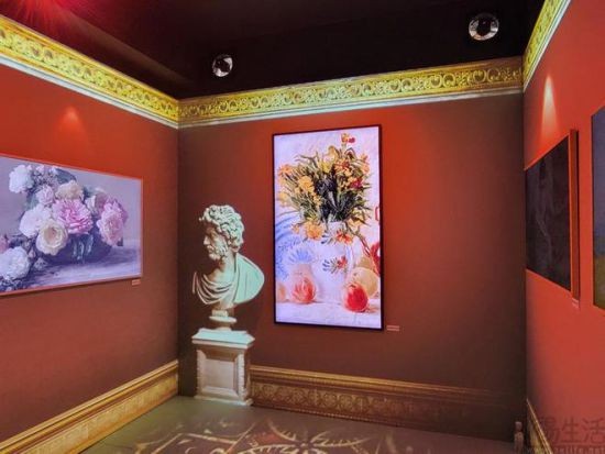 除此之外,在一间颇有艺术馆风格的“暗室”里,墙壁上的画框中正切换显示着一幅幅世界经典名画。哪怕是凑近仔细观看也很难相信,这带有独特木质框体和哑光纸质显示效果的设备,居然会是一台台电视。