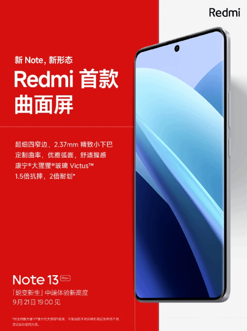 随后,小米官宣了Redmi首款曲面屏手机“Redmi Note 13 Pro ”。据介绍,该机型采用了超细四窄边、2.37mm精致小下巴定制曲率屏幕,配有康宁大猩猩Victus 1.5倍抗摔、2倍耐划玻璃。外观弧面优雅,握感舒适。