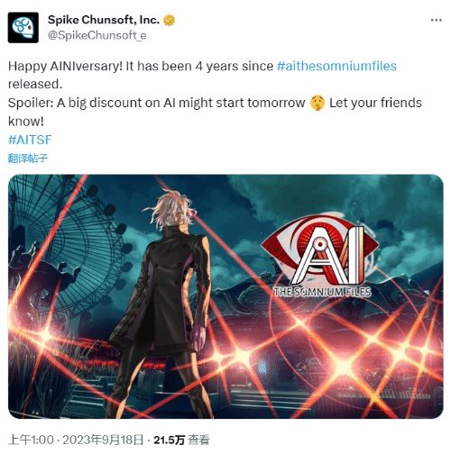 Spike Chunsoft官方发文,庆祝《AI:梦境档案》发售四周年,并透露预计明日开启游戏将举行大折扣。