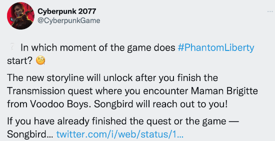 今日。《赛博朋克2077》官方发文提醒,当玩家在本体中遇到巫毒帮首领布丽奇特后,就可以选择开启资料片“往日之影”的内容,百灵鸟会联系你。