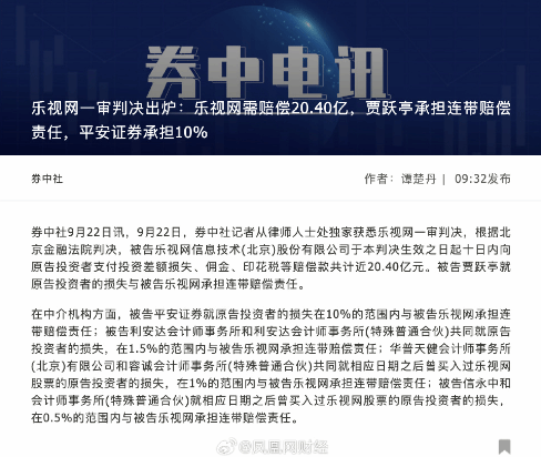 据凤凰网财经消息,记者从律师人士处获悉乐视网一审判决,根据北京金融法院判决,被告乐视网信息技术(北京)股份有限公司于本判决生效之日起十日内向原告投资者支付投资差额损失、佣金、印花税等赔偿款共计近20.40亿元。