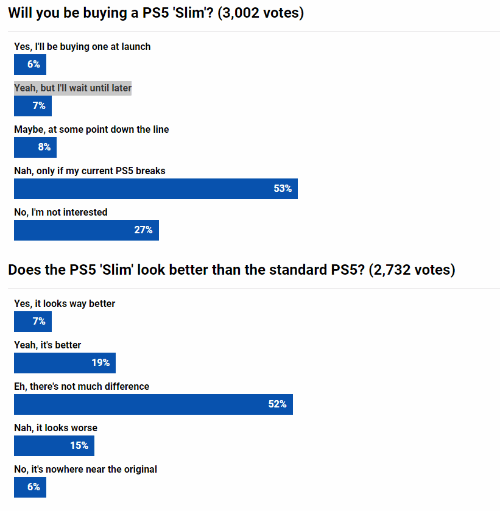 近日,外媒Pushsquare发布投票调查玩家们对于这款新机型的购买意向如何。截至发文,在超3000个用户投票中,有53%的玩家表示不会购买这款新机,除非自己现在的PS5损坏;27%的玩家直言对新机毫无兴趣;6%表示会首发购买;7%表示会观望一段时间后购买。