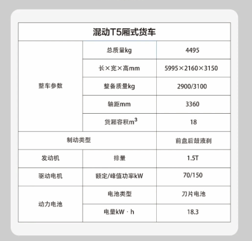 续航上,比亚迪混动轻卡T5采用比亚迪刀片电池,电池电量为18.3kW·h,满油满电时,最高续航可达1000km,高效电池包直冷,20%-80%充电小于30分钟。