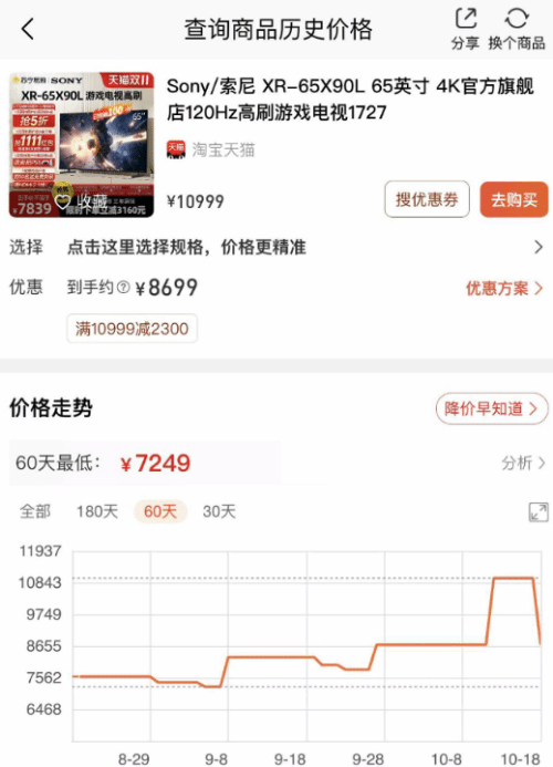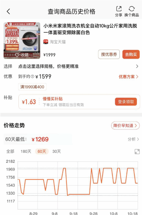 历史记录显示,小米天猫旗舰店的一款洗衣机在30天的售价先后历经5次起落,当前售价要比9月时的最低价1269元还要贵了300多。诸如此类的情况也出现在了其他品牌的商品上。