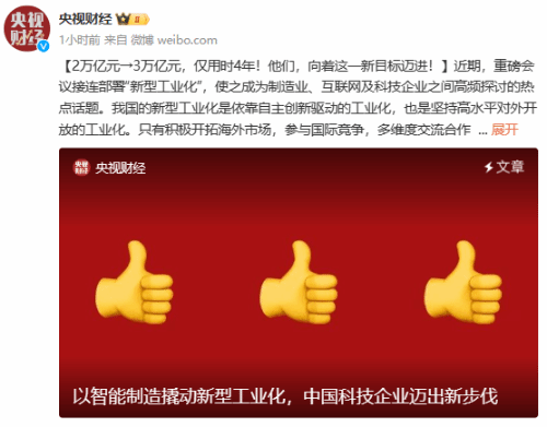 10月19日,手机中国注意到,《央视财经》发文,提到了重磅会议接连部署“新型工业化”,使之成为制造业、互联网及科技企业之间高频探讨的热点话题。文中,央视点赞华为、小米、比亚迪、宁德时代四家中国企业,其中重点提到了小米公司。