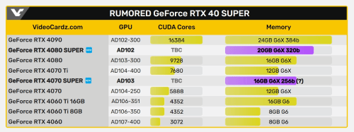 另外,据此前消息,RTX 4070 Super也将会有类似的升级,AD104核心换成AD103,显存从192-bit 12GB升级到256-bit 16GB。