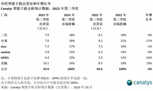 据Canalys统计,2023年第三季度,印度智能手机出货量达到4300万部,同比下跌3%,但环比增幅明显,已连续2季度上升。具体到排名上来说,Q3三星在印度市场仍保持领先,出货790万部,占据约18%市场份额。