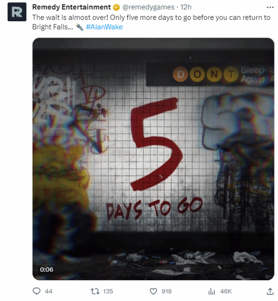 日前,remedy发布倒计时提醒,《心灵杀手2》还有5天发售:“距离返回亮瀑镇还有5天时间”。游戏将于本月27日正式上线。