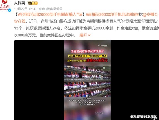 据人民网报道,近日,宿州市砀山警方成功打掉为直播间提供虚假人气的“网络水军”。