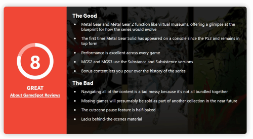 《合金装备大师合集Vol.1》即将推出,目前Gamespot已经为本作进行了测评,给出了8分的成绩。
