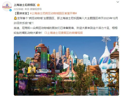 10月24日,@上海迪士尼度假区 正式宣布:全球首个“疯狂动物城”主题园区、即上海迪士尼乐园第八大主题园区将于2023年12月20日欢乐启“城”!