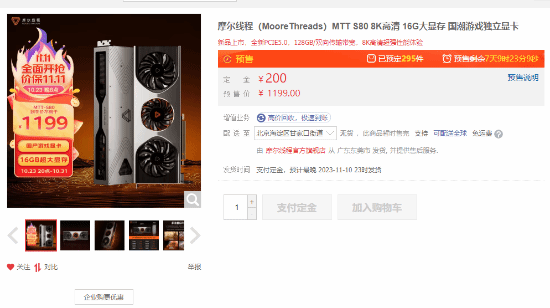 国产厂商摩尔线程于23日在京东开启MTT S80显卡定金预售,定金200元,官方显示到手价格不高于1199元。该显卡发布之初定价2999元。