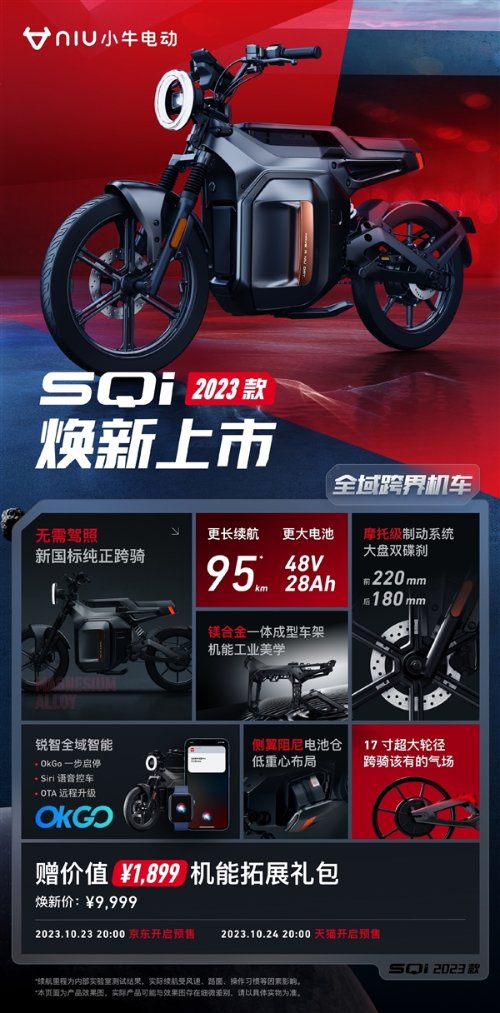 据小牛电动官方,品牌旗下全域跨界电动机车2023款小牛SQi正式上市,售价9999元,购买赠送价值1899元的机能拓展礼包,今晚8点在京东旗舰店开卖。