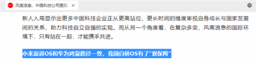 日前,《环球时报》发布了一篇名为《风高浪急,中国科技公司更需众志成城》的文章,其中提到“小米澎湃OS和华为鸿蒙路径一致,我国自研OS有了‘双保险’”。