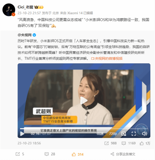 而在央视网的一档节目中,中国民营经济研究会副会长管清友和中信建投研究所所长、TMT行业首席分析师武超则两位专家也谈到了小米澎湃OS。