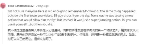 直到一位B社老玩家表示,在《上古卷轴:晨风》中的一个城镇内,一位精灵会从天而降到玩家面前:原来他正在测试一种可以让他“飞起来”的新药水,但实际上,这只是一种跳跃药水。这个场景或许是对《晨风》的致敬?各位认为这一奇怪NPC到底是怎么回事呢。
