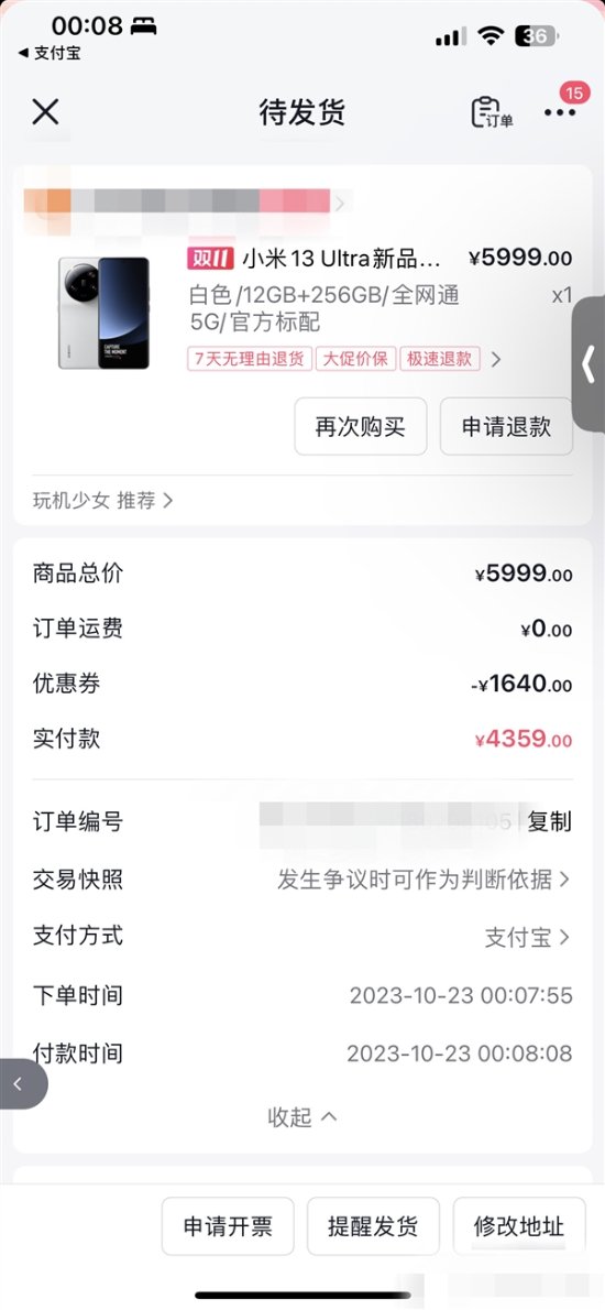 近日,有一位用户在酷安晒出订单,小米13 Ultra双11期间在第三方店铺价格降至新低,12GB 256GB入手价格是4359元,在同档位极具竞争力。