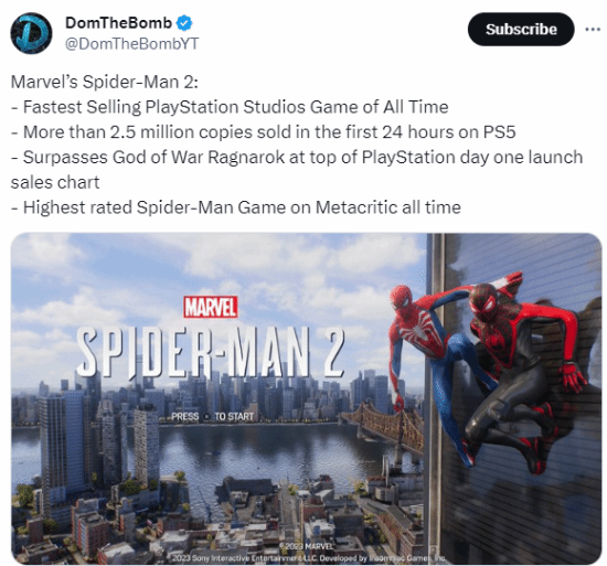 今日,博主DomTheBomb发文总结了《漫威蜘蛛侠2》发售以来各项破纪录的成就,一起来看一下吧。