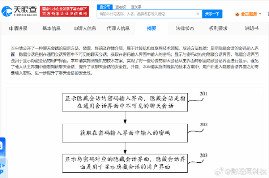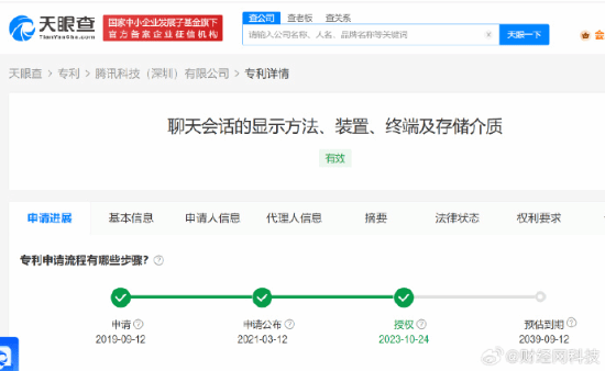 财经网科技报道,天眼查App显示,10月24日,腾讯科技(深圳)有限公司申请的“聊天会话的显示方法、装置、终端及存储介质”专利获授权。