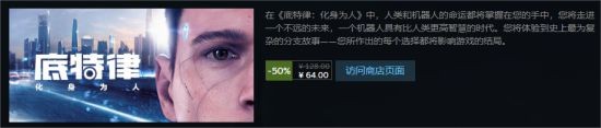 《底特律:化身为人》周促再次来袭,原价128,现在五折史低入手仅需64!周促从10月24日开始至10月30日结束,对科幻、人工智能剧情感兴趣的小伙伴不要错过这款精彩的游戏。
