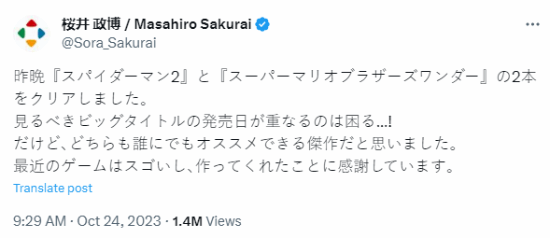 10月20日,《漫威蜘蛛侠2》和《超级马里奥兄弟:惊奇》同时发售,两款都是口碑极好的佳作。这让很多两者都喜欢的玩家犯了选择困难症,不知道先通谁好。但是游戏制作人樱井政博似乎没有这种烦恼,因为他已经全都通关了。
