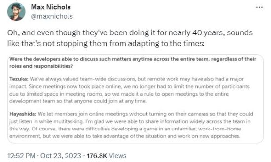 在2023年的当下,这五个人仍然被归功于参与制作《超级马里奥兄弟:惊奇》。宫本茂担任监制,手冢隆为制作人,中谷俊彦为关卡特别设计顾问,近藤浩二为音效总监。而森田和明则出现在特别感谢区。38年后,5名最初的开发者中有4人担任了主要的制作角色,这可能是游戏历史上最令人难以置信的开发者传承。