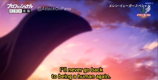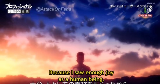 “我一直处于一种必须不断奋斗才能活下去的环境中。没有人想被巨人吃掉……但在现实中,敌人不是没有感情的怪物,而是像我们一样的人类……我认为自由就是人们可以继续他们的日常生活而不受威胁。我唯一想要的就是能在树下打个盹。这就是……这对我来说还不够。我想看一看风景。所以我想为之奋斗。我只是想战斗。”(来源:comicbook)
