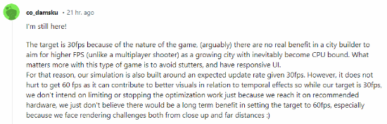 开发者表示,对于一款城市建造游戏,60fps和30fps的区别不大。事实上据玩家反馈,30fps下移动镜头和视角会有相当明显的抖动。