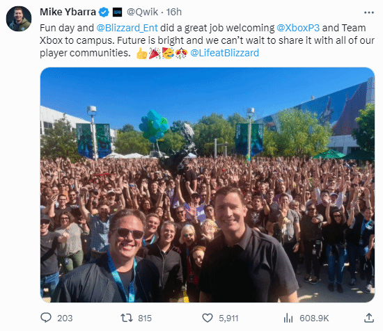 暴雪总裁Mike Ybarra今日在推特上分享了他与Xbox负责人Phil Spencer的合照,并配文:“有趣的一天,暴雪欢迎Spencer和Xbox团队来到校园。前途是光明的,我们迫不及待与我们的玩家社区分享。”