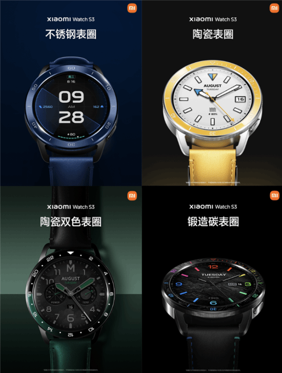 不仅如此,每款表圈都有对应专属的表盘,另外还有全新设计的上百款表盘样式可选。除了普通的表盘外,小米手表S3还新增了动态表盘、组件表盘、相册表盘。