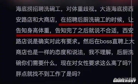 王女士在网络上发文称,海底捞在招聘后厨洗碗工的时候,让告知身高体重,告知完了就说不合适,在招聘软件上其他门店也是一样的说法。自己很不理解,后厨洗碗工为什么要看体重?现在要求也太高了,胖点就找不到工作了。