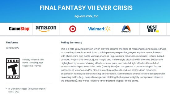 评级的细节描述也显示了很多关于《最终幻想7:永恒危机》的内容,评级提到游戏内部将可以购买随机道具,这意味着《最终幻想7:永恒危机》的Gacha系统也将出现在PC版本中。该系统鼓励玩家花钱购买某些道具,从而获得某些角色或武器。