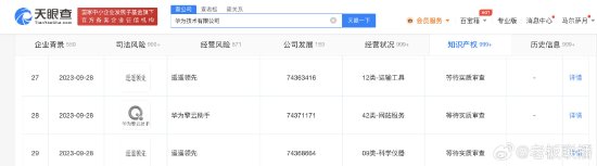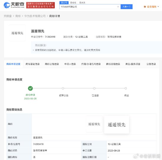 天眼查App显示,近日,华为技术有限公司申请注册“遥遥领先”商标,国际分类为运输工具、科学仪器,当前商标状态为等待实质审查。