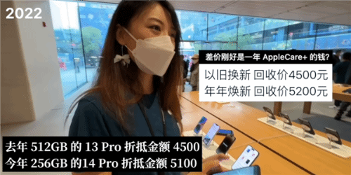 据了解,今年苹果官方的以旧换新价格有了明显的提升,甚至超过第三方平台。数码博主“钟文泽”在最新一期视频中表示,去年自己512GB的iPhone 13 Pro在苹果Apple Store折抵金额4500元,折抵比例是43%。而今年256GB的14 Pro折抵金额5100元,折抵比例是57%,同款机型在第三方折抵价格只有4333元。