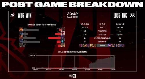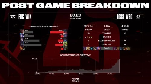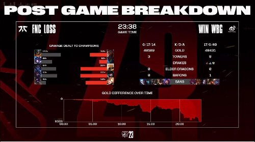 开局3分钟FNC盲僧来到下路,成功抓死烈娜塔,卡莉斯塔拿到一血。7分钟盲僧又来到中路,配合辛德拉击杀岩雀。13分钟FNC三人越塔击杀厄斐琉斯,但是芮尔也被换掉。14分钟WBG野辅配合岩雀在中路击杀辛德拉,15分钟FNC在河道击杀WBG中野。19分钟FNC众人在上路击杀岩雀,20分钟WBG打大龙逼团,FNC前来试探,WBG直接打出零换五并拿下大龙!23分钟WBG拿下小龙,还击杀FNC五人!27分钟WBG拆掉FNC上路水晶,转身拿下大龙。30分钟WBG从下路发起猛攻,击杀多人后一波推平,扳回一局!