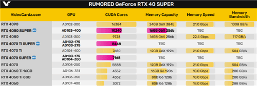 最近,关于RTX 40 SUPER系列升级版的消息接连不断,规格参数曝光得也越来越多。外媒kopite7kimi于近日第一次给出了三款型号的GPU核心编号、CUDA核心数量、二级缓存容量。