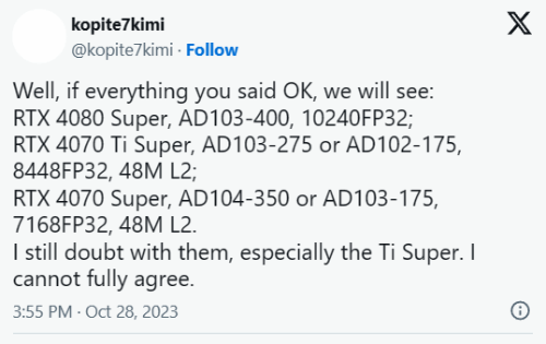 值得一提的是,RTX 4070 Ti SUPER将是第一款同时使用Ti、SUPER的型号,但是kopite7kimi表示它对这个名字存疑,不排除后续会有变化,甚至这些规格也可能会变。