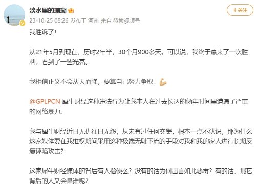 2023年5月26日,河南安阳市北关区人民法院一审判决被告北京犀牛助手文化有限责任公司于本判决生效之日起十日内公开向原告张亚周、李海书书面赔礼道歉,并连续三十日在GPLP犀牛财经网上刊载。