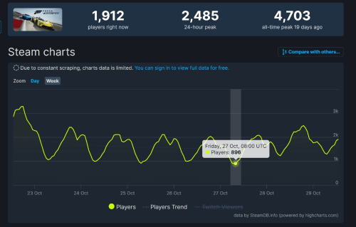 据SteamDB数据显示,在10月27日,本作在Steam平台的同时在线玩家一度跌至896。截至撰文,本作Steam在线人数为1912名。