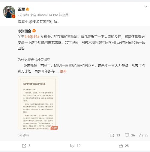 上周小米14正式发布,除了硬件升级之外,雷军宣布澎湃OS还配合存储做到了一个重磅功能——存储扩容。
