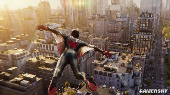 先从荡蛛丝的效果来说,你可以明显地看到《漫威蜘蛛侠》系列中的蛛丝真的黏着在建筑物上,小蜘蛛的飞行轨迹也有着明显的物理效果,呈现出来的效果更加真实。在刚刚发售的《漫威蜘蛛侠2》中,游戏还加入了新的滑翔玩法,让玩家赶路的姿势更加多样。