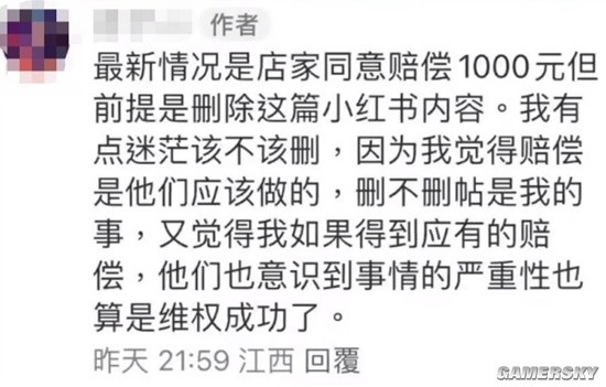 起初门店提出赔偿400元,该网友协商后,门店同意赔偿1000元并要求删帖。对此该门店回应称,公司已经在处理。