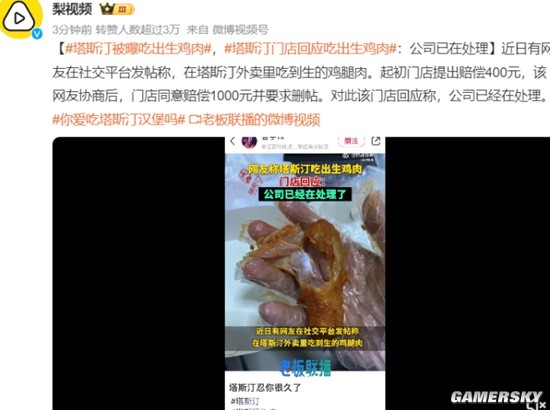 据梨视频报道,近日有网友在社交平台发帖称,在塔斯汀外卖里吃到生的鸡腿肉。