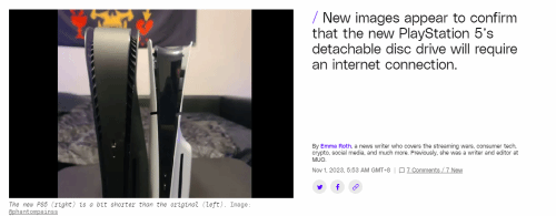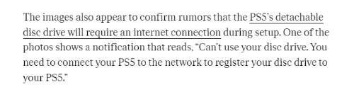 外媒The Verge记录到了部分图片,并发现此前有关新版PS5可拆卸光驱需联网使用的传闻似乎得以证实。